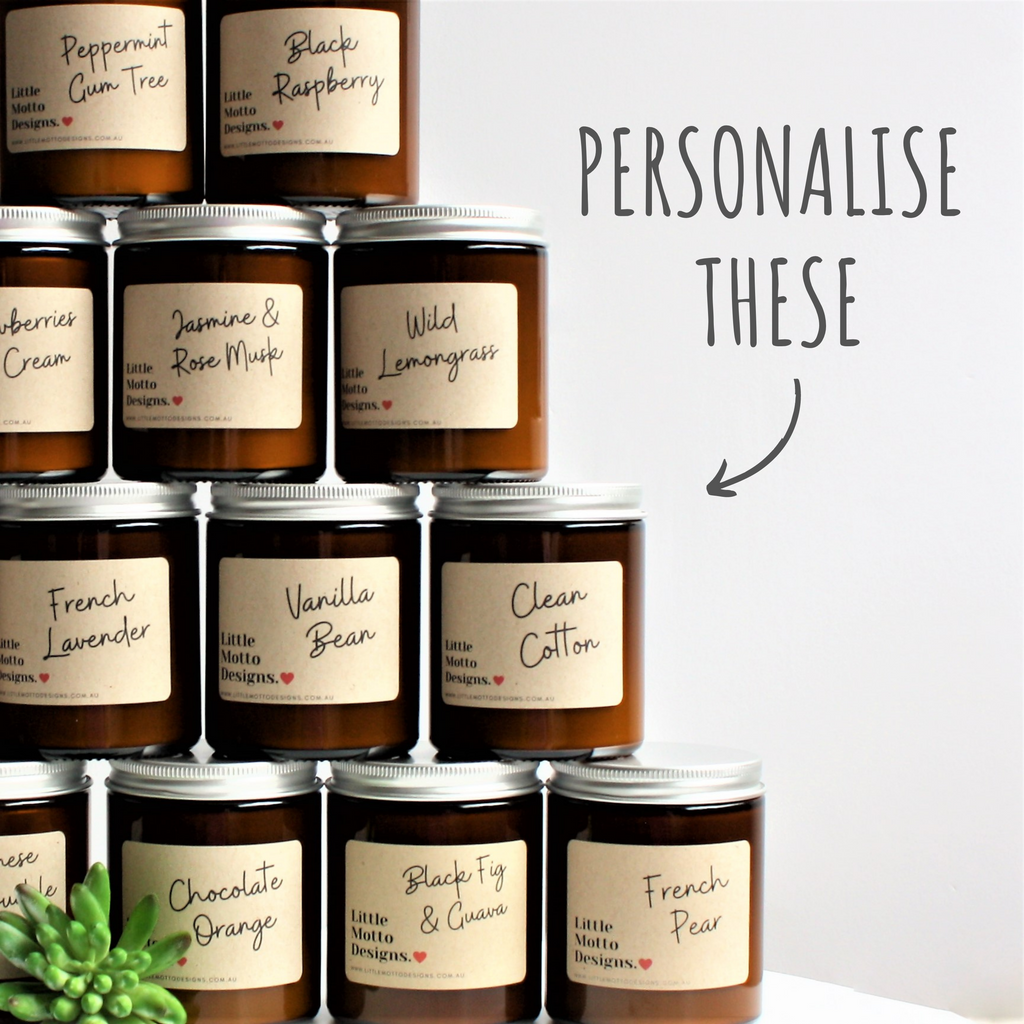 To PERSONALISE this candle please leave your custom message in the note section at checkout or email your logo to info@littlemottodesigns.com.au and you will be sent an artwork for approval.